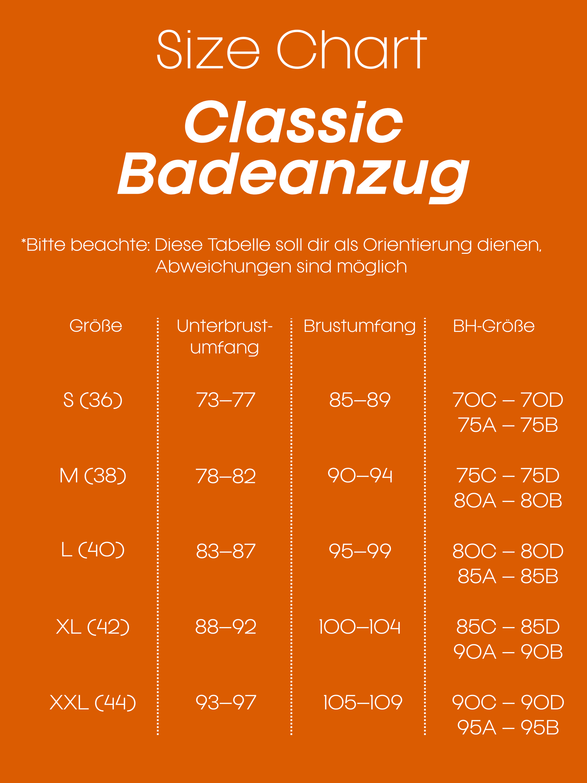 Der Badeanzug Classic überzeugt mit seinem schlichten, eleganten und zeitlosen Design. Der Stoff, welcher hier verwendet wird, ist seidenweich und schmiegt sich an den Körper an. Die auffällige rostrote Farbe ist ein echter Blickfang und verleiht dem Badeanzug das gewisse Etwas. Ein leichtes Schimmern des Stoffs rundet die Einzigartigkeit dieses Kleidungsstückes ab. Ein Lieblingsstück, das Freude beim Tragen garantiert.