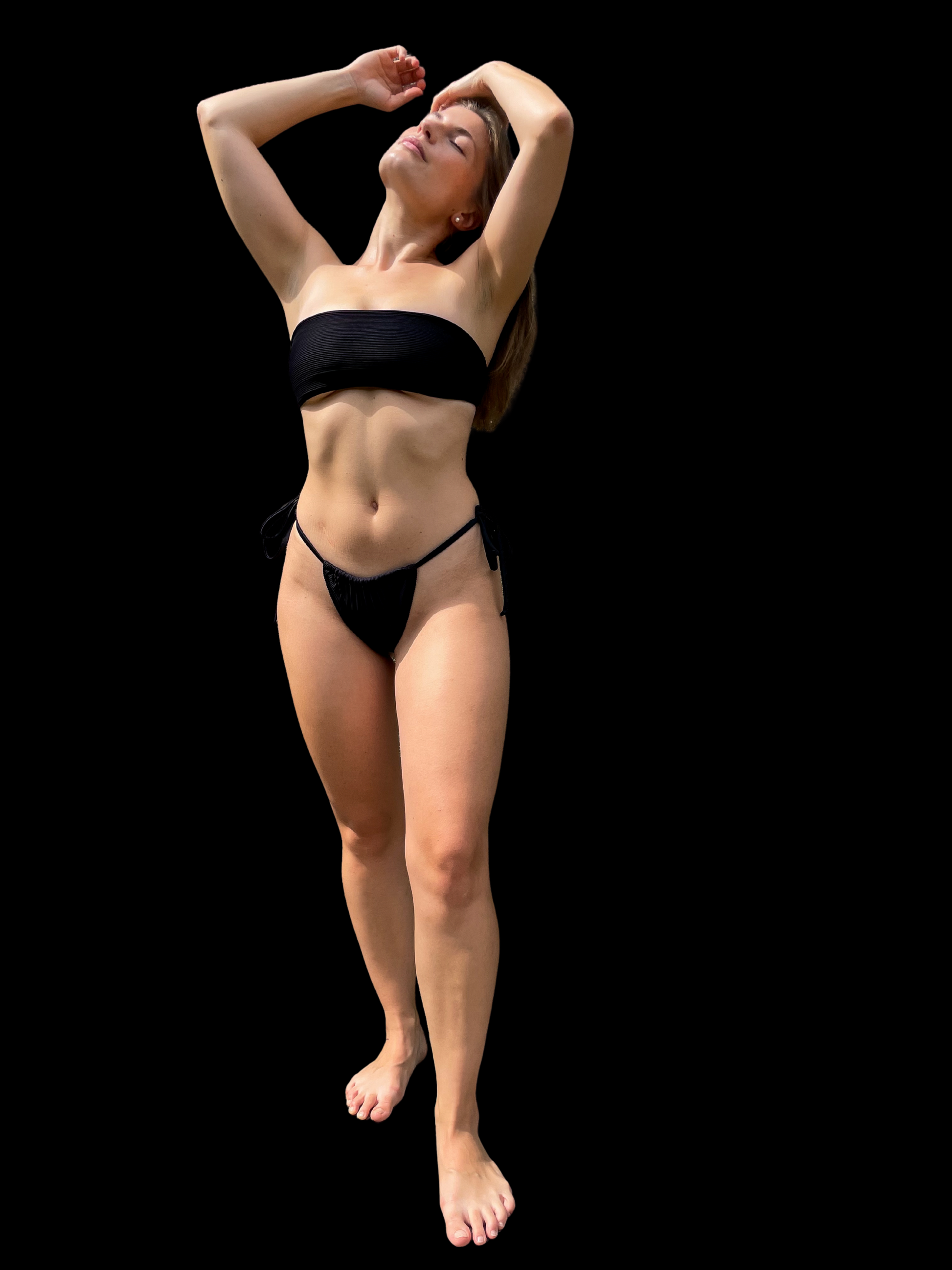 Das Bikini-Top Flirty in Schwarz besticht durch ein schlichtes und dennoch elegantes Design. Besonders hervorzuheben ist die einzigartige Stoffstruktur mit vertikalen Streifen, die dem Top eine attraktive Silhouette verleihen. Der etwas festere Stoff sorgt für hervorragenden Tragekomfort und eine optimale Passform. Durch die individuelle Verstellbarkeit mittels Schnüren lässt sich das Top perfekt an deine Bedürfnisse anpassen, was für einen sicheren und bequemen Sitz sorgt.