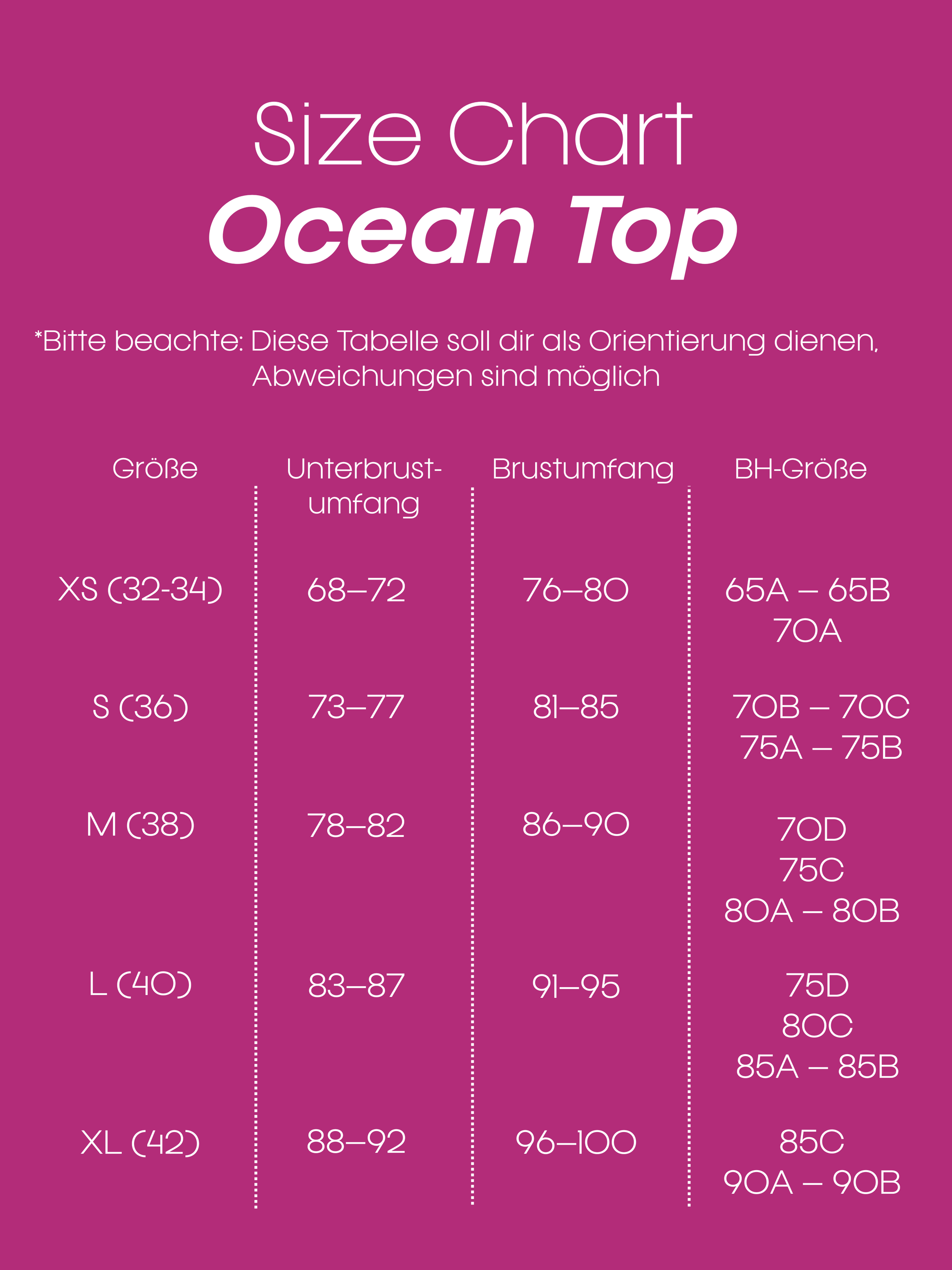 Das Bikini-Oberteil Ocean bietet Eleganz, Komfort und Sexyness. Der durchgehende Bügel verschafft Deiner Brust Halt, die Falten betonen die Form Deiner Brust. Es lässt sich hervorragend mit verschiedenen Höschen kombinieren, wodurch ein ganz individueller Look kreiert werden kann. Durch die Frische der Farbe purpur wirst Du ganz Sicher zum Hingucker.
